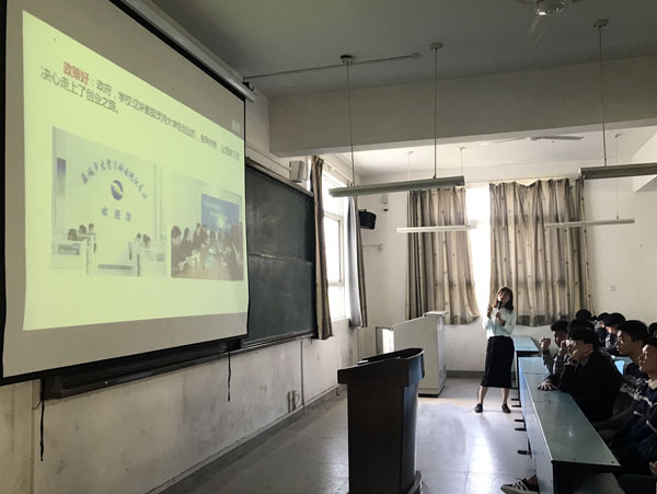 可仕静是电子信息学院电艺201201班学生,毕业后响应家乡大学生创业的号召,创立了麻城零度科技有限公司,现任公司经理。在创业报告会上,介绍了自己的公司项目,结合自身的创业经历,从当前大学生的创业环境、优惠政策、创业能力、优势弊端、创业项目选择、创业途径、相关风险、创业方向等角度,生动形象地为在场的同学们上了一堂生动的创业课,赢得了现场同学们的阵阵掌声。