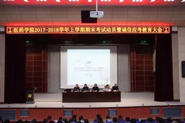 期末考试即将举行,为严肃考风考纪,进一步检验教育教学质量,医药学院于12月14日召开了2017-2018学年上学期期末考试动员暨诚信应考教育大会。学院领导班子、班级辅导员、团总支学生会学生干部,以及各班级班长、团支书、学习委员参加了会议。大会由党总支副书记欧阳风雷主持。