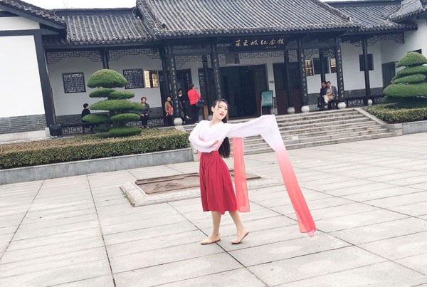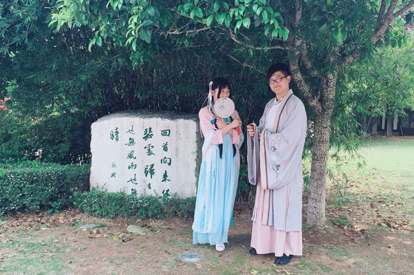 诗词鉴赏班彭逸云同学在苏东坡纪念馆前的广场上表演了根据苏轼《但愿人长久》编排的舞蹈;班长干博同学和他的小伙伴徐梦妮身着汉服穿行在遗爱湖公园,更是博得所有游园人的眼球。