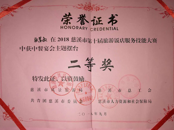 金秋九月捷报频传,实习学子喜获美誉。9月18日,商学院2016级学生张慧敏在慈溪市第十届旅游饭店服务技能大赛中勇夺中餐宴会主题摆台大赛二等奖。