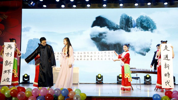 锣鼓叮咚敲起来,四人盛装走上台,平安黄职三句半,默契配合齐点赞。同学们以“三句半”的形式表达了对共建平安和谐校园的共同愿望和努力。丝弦一拨风情万种,乐曲一响雷霆万钧,古筝演奏《春到湘江》与现场毛笔书法相结合,彰显了中华文化的博大精深,展示了青年学子的多才多艺。朗诵《改革开放四十周年——颂中国奇迹》,生动再现了中华民族伟大崛起,伟大祖国的繁荣昌盛。小品《一切都是最好的安排》寓教于乐,告诫同学们要有良好的心态,不轻言放弃的耐心和随机应变的能力。武术表演《群龙天下会》,尽显中华武术魅力和气魄。皮影《时光》以时间为轴,演绎了当代大学生的多彩青春。《不如跳舞》和《民歌串烧》以娴熟的舞步、曼妙的音乐,紧紧抓住了观众的眼球,扣人心弦。美丽中国魅力无限,和谐中国精彩有约,歌曲《美丽中国走起来》再度引爆全场。
