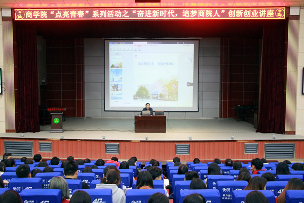 3月26日晚18:10,商学院在学术报告厅开展“点亮青春”系列活动之“奋进新时代,追梦商院人”创新创业讲座,讲座由商学院党总支副书记刘洋主讲。商学院专兼职辅导员出席了活动,2017、2018级全体在校学生聆听了本次讲座。