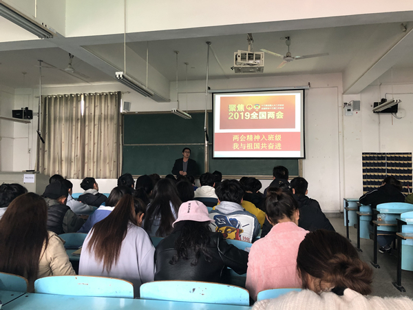 为了让同学们认真学习“两会”精神,心系“两会”动向,关注“两会”热点,3月28 日下午,生物与制药工程学院在育贤阁203多媒体教室开展了“‘两会’精神入班级,我与祖国共奋进”为主题的学习活动。生物与制药工程学院各班级学生代表参加了本次活动,生物与制药工程学院党总支副书记朱元锋做2019年“两会”精神宣讲。