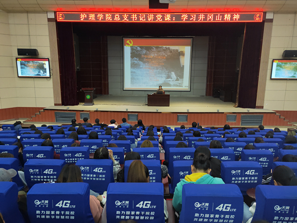 为引导青年学生更深入学习习近平新时代中国特色社会主义思想,坚定理想信念,做新时代有为青年,着力推进学校“五个思政”建设。4月11日18:00,护理学院举办了“学习井冈山精神,传承红色基因”专题党课,2018级全体学生近700人齐聚学术报告厅聆听了党课。党课由护理学院党总支书记王莹华主讲,党总支副书记张朋生主持。