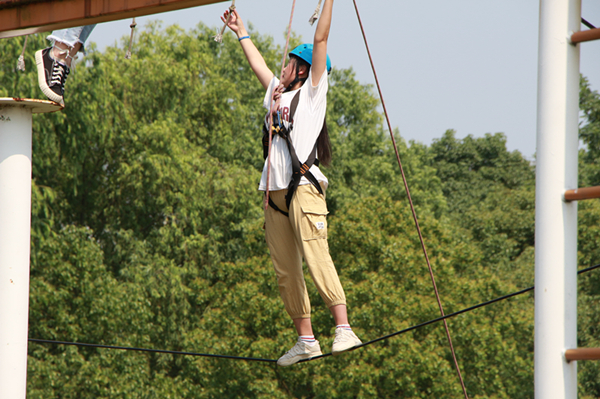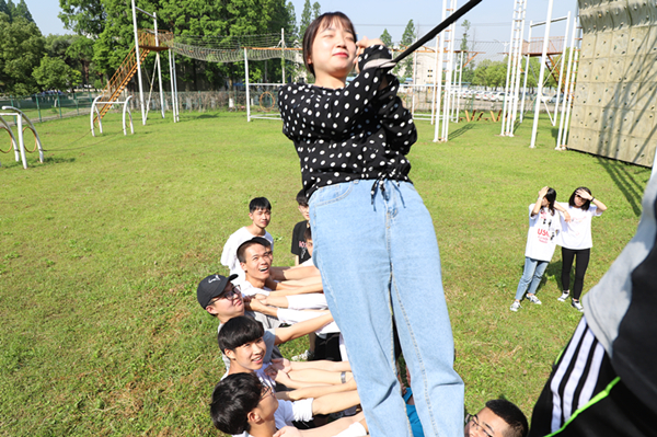 集合完毕,熊楚舒向参训的教练和同学们进行了安全提醒,随后,同学们热情高涨地跟随着教练投入到活动中。活动将参训人员分成5组,各队分别确定了团队的队员,并选出自己的队长,通过团队建设,培养了学生的团队意识和竞争意识。活动中,教练带领各队同学参与了众志成城,信任背摔,万里长城永不倒,齐心协力,飞夺泸定桥,攀岩,高空断桥等项目。在紧张刺激活动中,每一个队员克服了心理障碍,通过突破自我、相互信任、团结协作、默契配合,完成了对身心的极限考验。
