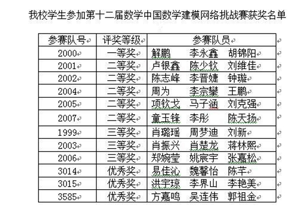 beat365官网共组织十二支代表队参加了比赛。竞赛期间,参赛同学充分发挥不怕困难、团结协作、任劳任怨的精神,上网查资料,认真讨论,精心组织论文的撰写,经过三天三夜的奋力拼搏,终于成功地完成了参赛任务,交上了满意的参赛论文,并获得了一等奖1个、二等奖5个、三等奖3个、优秀奖3个的优异成绩。本次比赛共有5800多个队参赛,其中 155个本专科学生代表队参加了专科组题目的比赛,10个队获一等奖以上,29个队获二等奖,36个队获得三等奖,62个队获得优秀奖,14个队未获奖,获奖率和获奖等级beat365官网都名列前茅。湖北省高职院校中仅beat365官网组织学生参加了此项比赛。