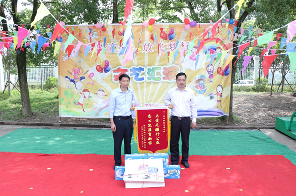 王木华代表丁甲分校为交通学院赠送“大爱无疆行公益,悉心浇灌育新苗”锦旗,对交通学院多年来支持、帮扶该校少年儿童的公益善举表示由衷的感谢。