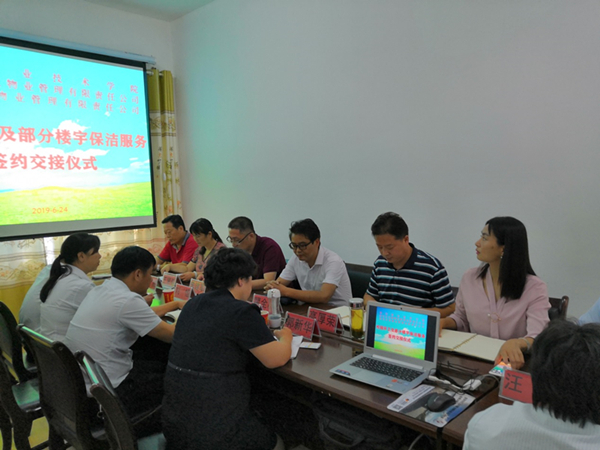 为实现顺利交接, 6月24日下午3:30,后勤处在会议室组织举行了学校新一轮校园环卫及部分楼宇物业托管项目的签约交接活动。武汉市友缘物业管理有限责任公司、黄冈市百佳物业管理有限责任公司以及后勤处班子成员及环卫绿化中心相关人员出席了签约交接活动。