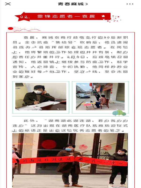 沧海横流显砥柱,袁晨在疫情防控志愿工作中的先进事迹已被“青春麻城”微信公众号报道和宣传。