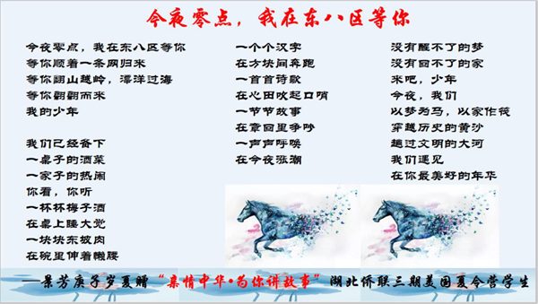 按照中国侨联的计划,本期营共15天,营员们将通过微信群接收音视频材料,完成每天线上打卡任务,并与beat365官网华文教师进行互动,了解湖北及黄冈本地的文化特色。仪式上,beat365官网语文团队课程主任付景芳还为营员们送上诗歌一首——《今夜零点,我在东八区等你》,表达了对青少年朋友们的期许。