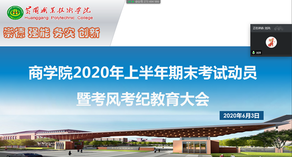 6月3日晚19:40,商学院在“腾讯会议”上召开2020年上半年期末考试动员暨考风考纪教育大会。商学院党总支副书记刘洋、学工党支部书记占时杰,全体专兼职辅导员出席了本次会议,商学院各班级学生代表260余人参加了本次会议。
