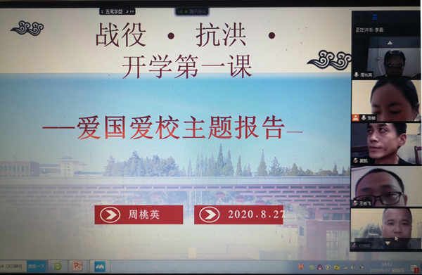 周桃英围绕战疫抗洪、爱国爱校、思学奋进三个方面展开阐述,肯定了“一村多名大学生计划”学员在抗疫和防洪上所作出的贡献,宣传了抗疫和防洪中涌现出的典型;鼓励学生爱国爱校,积极进行职教宣传;呼吁同学们在校自律学习、尊重知识,珍惜生命、注重身心健康,敬畏自然、敬重科学,肩负家国情怀和责任担当。