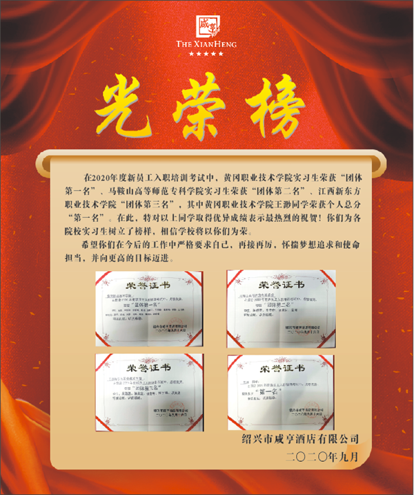 日前,beat365英国官方网站收到浙江绍兴咸亨主题酒店的培训考核荣誉证书。在公司2020年度新员工入职培训考试中,黄职学子以最高平均分的绝对优势获得团体第一名;王渺、李玉婷、舒雅琪三位同学在个人成绩排名中包揽前三名。经过考核竞争,学校五位实习生获得前厅文化使者工作岗位。