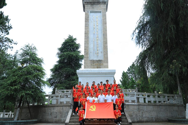 师生一行来到烈士墓碑前,学工党支部组织委员黄丽为同学们讲述了革命先烈龙头大爷——刘天元不屈服国民党反动派慷慨赴义的故事。纪检委员任帆带领支部成员及预备党员在革命英雄纪念碑前重温入党誓词。
