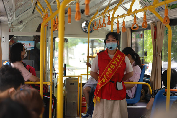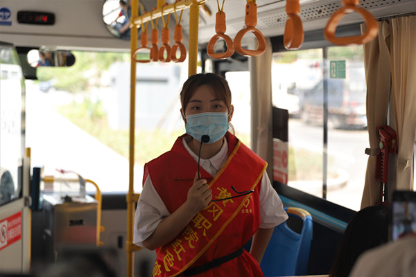 5路公交车从首站出发,车厢内响起了红色宣讲员段斯琦动情的介绍声:“各位乘客朋友,大家好!今天我为大家带来的红色故事有两个主人公,一个是名声显赫的大将,一个是普普通通的大娘,大将与大娘之间到底有着怎样的故事呢……”红色宣讲员抑扬顿挫、富有感情的语言,让乘客纷纷放下手里的手机,专注地聆听。听到动情处,乘客们轻轻地鼓起掌来。