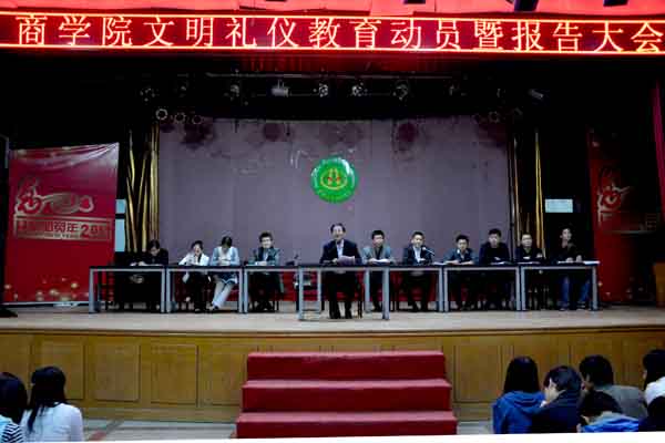 文明礼仪动员会上,首先由团总支副书记崔现强宣读了《商学院2011级学生文明礼仪教育活动方案》,并对活动作了统一部署。接着,工商201002班王志军同学代表2010级全体同学就去年开展文明礼仪教育活动作了经验交流;随后,酒店201102班刘思琦同学代表2011级全体同学就开展文明礼仪教育活动作了倡议发言。最后,商学院党总支副书记杨勇同志从四个方面作了文明礼仪教育活动的总动员讲话,他对文明礼仪的涵义及内容作了阐述;对开展文明礼仪教育活动的重要意义作了强调;对开展文明礼仪教育活动的具体要求作了部署;对开展文明礼仪教育活动的实施方法作了指导。他希望全体同学“播种文明,浇灌礼仪,收获辉煌”。