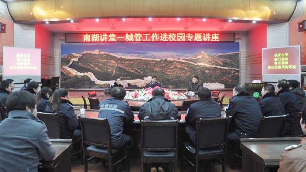 12月27日下午,保卫处邀请市城管执法局督查支队贺群新支队长来beat365官网作“城管工作进校园”专题讲座。报告会在凝智楼四楼中心会议室举行,学校全体保卫人员和120名学生干部代表聆听了本次讲座。