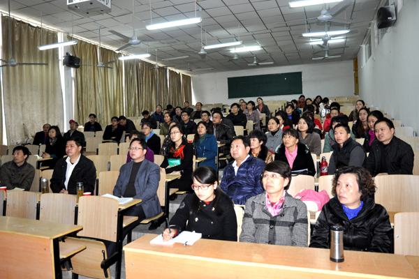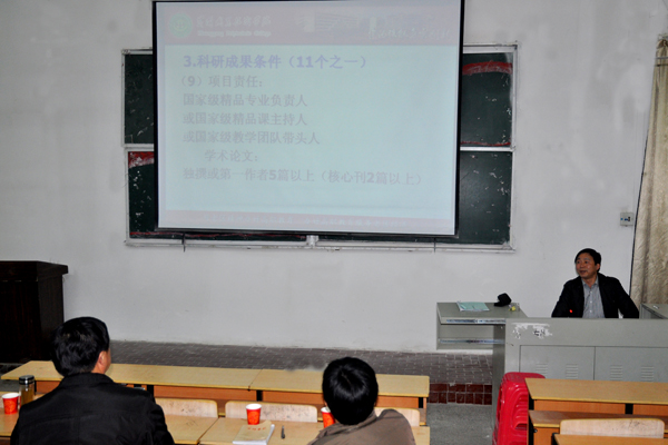首先,袁院长在论述了个人职业发展与组织事业发展两者协调发展的重要性的基础上,详细解读了湖北省高职高专教师专业技术职务任职资格申报评审条件(鄂职改办[2013]120号文件),并分析了黄冈职院高职高专教师系列岗位职责,与教职工共同探讨了各级岗位的共同要求和不同要求。
