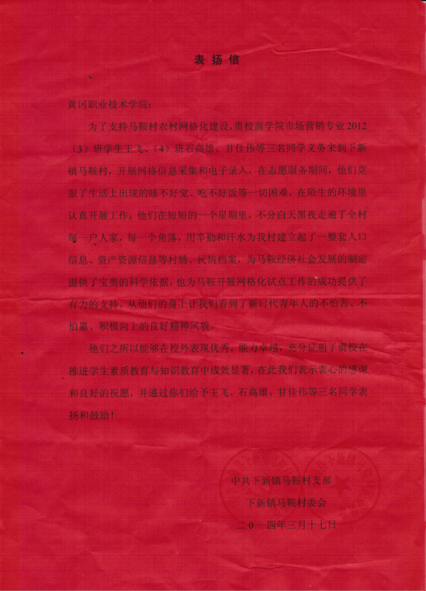我院市场营销专业学生王飞、高雄、甘佳伟3名同学受到黄梅县下新镇马鞍村委会表扬。