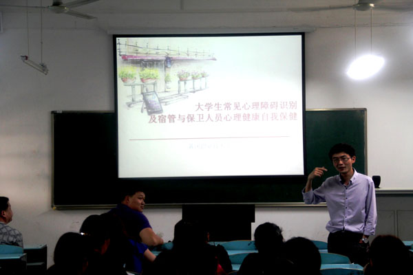 2014年5月18日下午2点30分,由beat365官网学工处心理咨询中心、宿管中心主办的“大学生心理障碍识别及宿管与保卫人员心理健康与自我保健”专题心理讲座在育贤阁302教室举行。校团委书记杨勇、保卫处副处长汤城等有关领导及全校宿管与保卫人员参加了此次讲座。本次活动由宿管中心主任魏传钧主持。