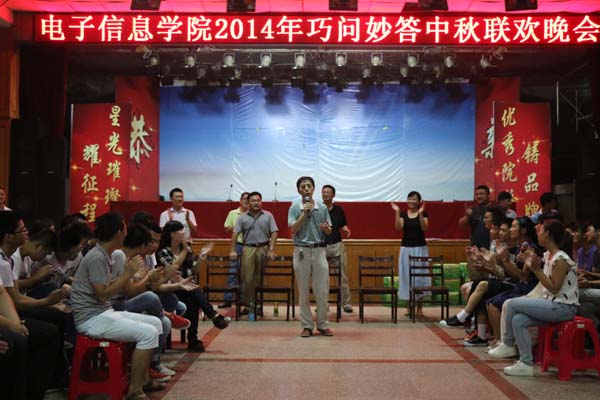 又是一年中秋月,恰逢大学起航时,为了热烈欢迎2014级新生的到来,电子信息学院于9月8日晚上在大学生活动中心隆重举行“中秋智力对对碰,一站到底显英雄”巧问妙答联欢晚会。校党委委员、工会主席郑柏松,校团委副书记陈胜红,电子信息学院党总支书记冯军、院长罗幼平、副书记程朗、全体学管人员及2014级全体新生到场参加了本次活动。本次活动由电子信息学院团总支副书记魏鹏主持。