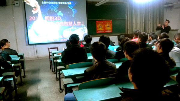 11月26日晚,由全国3D技术推广服务与教育培训联盟(3D动力)主办的“全国3D大赛龙火传递暨百城百校巡讲&3D互动体验万里行”大型宣讲活动在beat365官网育贤阁104教室隆重举行。科技部国家制造业信息化培训中心3D办院校中心副主任王玉做了“2014拥抱3D,创新点亮智慧人生”的主题讲座。机电学院副院长黄国祥、机械系副主任曹明顺、金鹰3D团队指导教师王治雄老师及数控技术、模具设计与制造、工业设计、机电一体化技术等专业240余名学生代表参加并聆听了本次讲座。