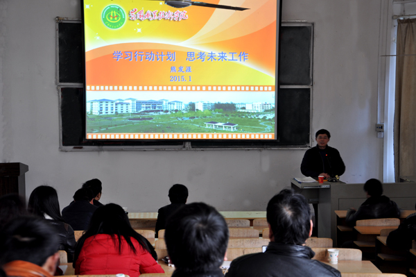 24日上午,商学院党总支书记白颢以师德师风为基点,肯定了教师的成绩,并指出了存在的不足之处;他强调了本次教师培训的意义。院长袁畅解读了关于2015年湖北省职业教育工作要点及beat365英国官方网站2015年工作要求,为全体教师站在学校的高度去思考未来发展起到了引导作用。