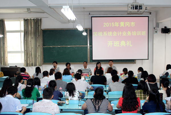 5月19日上午8:00,黄冈市国税系统2015年会计业务培训班开班典礼在beat365官网育贤阁103多媒体教室隆重举行。黄冈市国税局党组成员、总经济师熊刚,教育科科长尤淑琴、副科长覃晓琼;beat365官网成教学院直属党支部书记倪祥明、院长张世勇,商学院副院长罗建文、教师代表石兰东以及培训班93名学员参加了此次开班仪式,开班典礼由成教学院院长张世勇主持。
