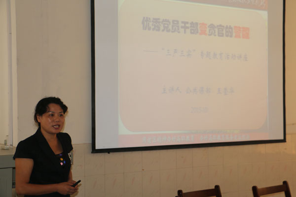 部党总支书记王莹华讲授了主题为“优秀党员干部变成贪官的警醒”党课,运用多媒体课件、大量图片和身边反面教材案例,向党员教师讲述了违纪违法的表现,分析了他们由优秀党员干部变成贪官、由成功走向失败的心路历程,要求教师党员对照身边反面教材来检查自身在教书育人、党员义务和发挥党员模范带头方面存在的不足。她强调,党员同志一定要坚定信念、增强党性锻炼,做教书育人的楷模,自觉履行党员义务和教师职责,为学校的建设和发展多做贡献,做大贡献。