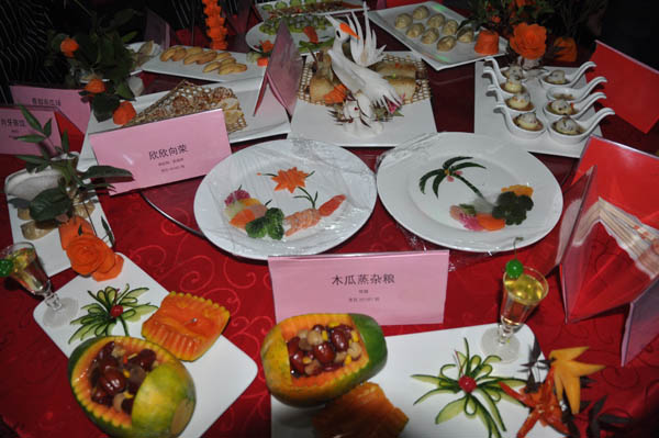 竞赛在南区食堂二楼国际旅游学院实训基地举行,出席本次活动并担任评委的领导有党委委员夏学文、校企合作处副处长王银林,商学院党总支书记白颢、院长袁畅、副院长罗建文、旅游系主任李龙星以及国际旅游学院副院长苏礼江、孔健,烹饪工艺与营养实训中心厨师长曹仁。袁畅就以赛促学、以赛促教的目的意义和方法作了简短讲话,并强调烹饪工艺是技术,是技艺,是艺术,是文化,希望大家通过大赛展示同学们的精神风貌与技能水平,通过大赛促进烹饪工艺传承与创新,鼓励参赛选手勤学苦练、积极进取、勇于拼搏、大胆创新,努力成为厨界新秀。总裁判长烹饪专业教师杨清宣布了竞赛规则。在夏学文宣布比赛正式开始后,烹饪专业莘莘学子们纷纷呈上精心制作的菜肴、面点、冷拼雕刻,共三类60多道菜点,可谓花样品种繁多、色彩丰富,色香味型俱佳,充分展示了烹饪专业学生高超的烹饪技术和技艺,获得评委和观众点赞。