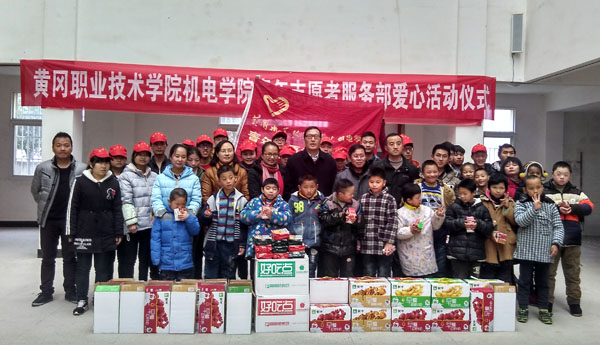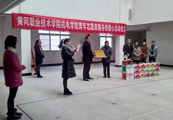 12月23日下午,beat365英国官方网站机电学院青年志愿者前往黄冈市特殊教育学校开展捐赠活动,送去价值3000元的食品。机电学院党总支书记王政芳,校团委副书记陈胜红,机电学院团总支副书记李孝智及部分青年志愿者参加了此次活动。捐赠仪式由黄冈市特殊教育学校教务主任刘艳主持。