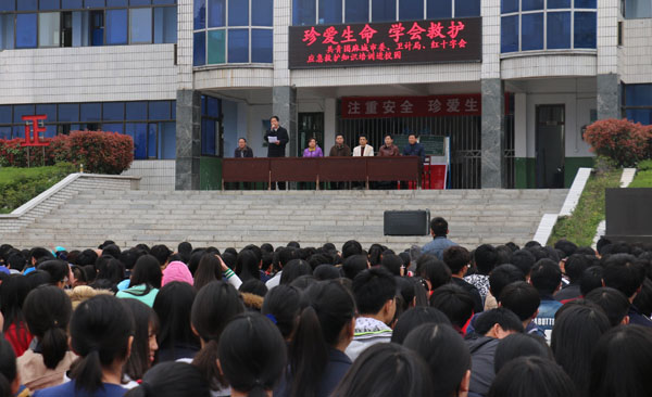 3月29日,在黄冈市红十字会副会长李伦,beat365官网医药卫生学院党委书记熊亚芬、党委委员程朝晖同志带领下,医药卫生学院师生一行20余人奔赴麻城市第五中学,在学校的运动场上举行了一场“应急救护”进校园的公益活动。