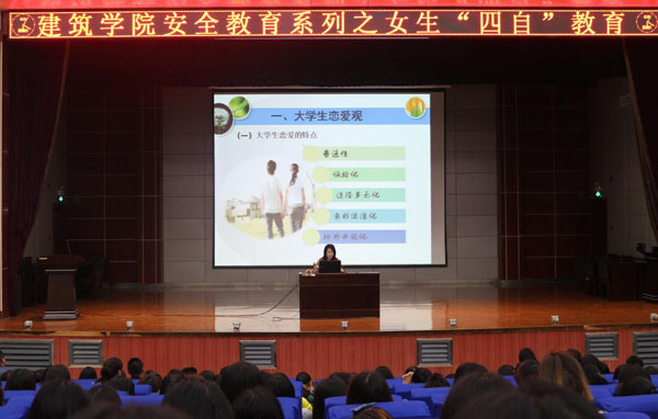 4月24日晚,建筑学院团总支在新学术报告厅举行了“安全法纪教育”专题讲座和“学会爱 认识性”的女生“四自教育”专题讲座。出席此次活动的有建筑学院团总支书记田涛老师,建筑学院2014级、2015级全体专兼职辅导员以及大一大二两个年级197名女生和470名男生聆听了讲座。讲座由建筑学院团总支书记田涛老师和女生辅导员胡丹梅老师主讲,辅导员林迁老师主持。