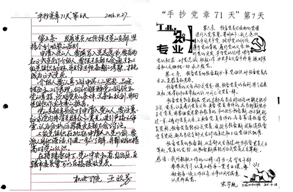 “手抄党章71天”活动是指从4月22日开始至7月1日止,用71天的时间,采取手抄的形式,对党章全文17000余字进行抄写,每天平均200字左右。通过每天坚持抄写党章,引导学生党员和学生干部逐句逐字研读党章,领会党章内容,让思想受教育,精神受洗礼,意志受锤炼。在抄写的过程中,深刻领会党章的内涵和意义,对照“两学一做”的活动要求,寻找差距,使自己成为一名合格党员或学生干部。