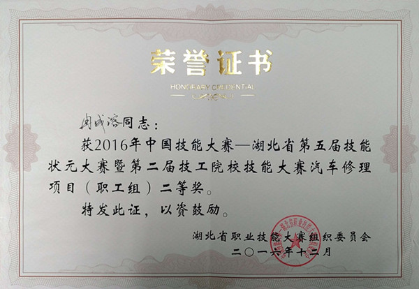 2016年12月15--16日,2016年中国技能大赛——湖北省第五届技能状元大赛汽车修理技能竞赛在荆州湖北民间工艺技师学院举行。竞赛由湖北省人力资源与社会保障厅等4部门主办,荆州市委组织部、荆州市人力资源和社会保障厅、荆州市职业培训和技能鉴定管理中心以及湖北民间工艺技师学院承办。
