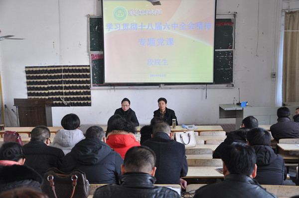 课上,段院生首先分析了党的十八届六中全会召开的背景,并对十八届六中全会的主要精神进行了解读。他指出,党的十八届六中全会是在中国共产党成立95周年、红军长征胜利80周年的历史节点,在全面深化改革、决胜全面小康的关键时刻,召开的一次十分重要的会议。全会明确习近平总书记的核心地位、正式提出“以习近平同志为核心的党中央”;全会专题研究全面从严治党重大问题,对于丰富完善“四个全面”战略布局、坚持和发展中国特色社会主义具有重大意义。接着,他将十八届六中全会精神的学习和学校的发展现状紧密结合,给在做每位教职工提出了具体的要求。他提出,作为一名教育工作者、一名灵魂培育者,首先要在思想上树立政治意识,要把握大方向才能有大发展;其次,要加强学习,不断充实自己。