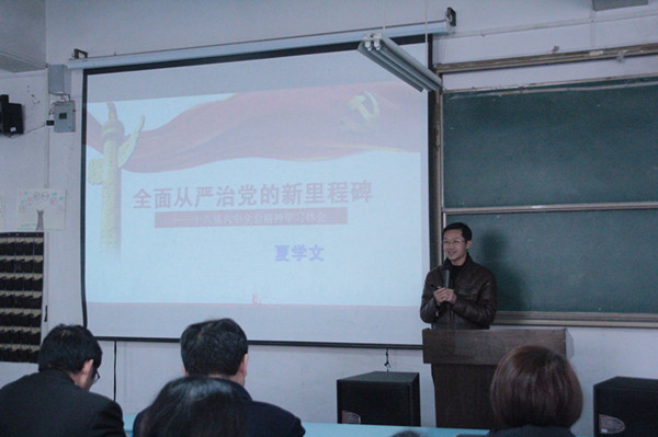 为深入学习贯彻党的十八届六中全会精神,把广大教职工的思想统一到全会精神上来,把力量凝聚到落实全会部署的各项任务上来,2016年12月15日下午,学校党委委员夏学文同志在育贤阁104教室作了《全面从严治党的新里程碑——十八届六中全会学习体会》专题报告,建筑学院、教务处、国资处等部门全体教职工聆听了报告,报告会由建筑学院党总支书记刘晓敏主持。