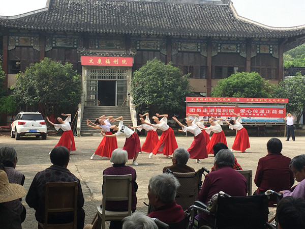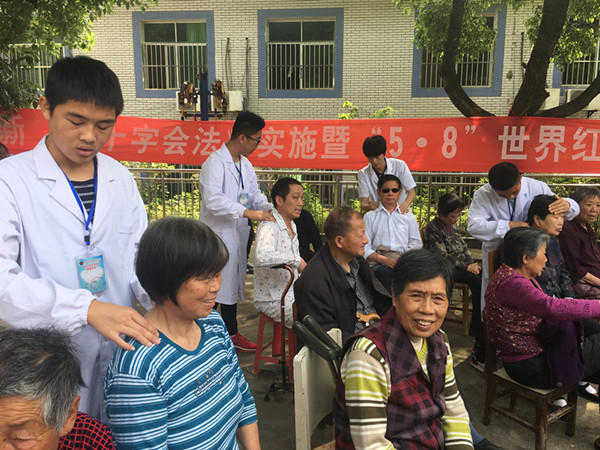 活动中,校大学生艺术团志愿者们为老人们表演了精彩的文艺节目。动感的健美操、优美的歌曲、充满民族气息的舞蹈以及黄梅戏表演,给现场的老人带来了欢乐。张彬技能大师工作室带来的烹饪技艺展示,以及为老人们送上的东坡美食,更是让在场的老人感受到了温暖。文艺表演之后,护理学院的凌莉老师对福利院的护工开展了康复推拿及褥疮护理的培训;医药学院团总支负责人闫林军老师则带领红十字协会和康复协会的同学为老人测量血压、推拿按摩,与老人亲切聊天;园林园艺协会的同学对福利院的花草进行了养护,其他志愿者们则走进老人房间为老人整理衣物、打扫卫生。大家分工协作,福利院内一派勃勃生机,“红马甲”成为一道崭新靓丽的风景线。