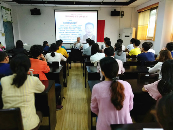 在一个多小时的讲课中,80高龄的吴老用充满激情的话语、渊博的东坡文化知识和深厚的禅学功底,向听众讲明了佛教与禅宗的关系,并用几首苏东坡不同时期的诗词代表作,深入阐明了苏东坡如何深受禅宗影响、又如何通过诗词来表达他的禅宗理念的进化脉络。