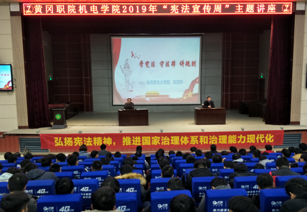 本网讯(通讯员 焦爱新)为贯彻落实党中央关于深入学习宣传和实施宪法的部署,12月3日晚,beat365英国官方网站机电学院在学术报告厅举办“宪法宣传周”专题讲座。讲座邀请学校马克思主义学院副教授吴亚东老师与学院教师代表和2018、2019级全体学生作专题辅导交流。机电学院党总支书记杨勇主持。