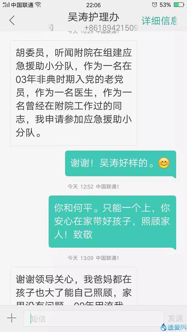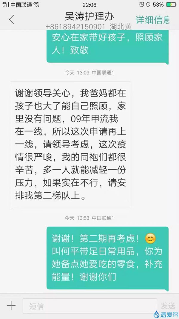学校护理学院吴涛老师在附属医院职工的妻子处得知此次征募消息后,也第一时间向学校分管该工作领导主动请缨,要求参与到此次的应急救援工作中,夫妻两人齐齐要求前往第一线,在申请短信中吴涛写道:“作为一名在非典时期入党的老党员,作为一名医生,我申请参加应急救援小分队;09年甲流我在第一线,这次申请再上一线,这次疫情严峻,我的同袍们都很辛苦,多一个人就能减轻一份压力。”短短几十字的申请短信,是吴涛践行一名共产党员以担当显初心,以奋战践使命的庄重承诺,他在用行动诠释着一名共产党员的“责任”与“担当”,在疫情面前,不畏艰难,冲在一线,把抗击疫情第一线作为主题教育的实践场。