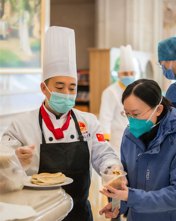 2月1日,张彬带领6人团队正式进驻黄冈维也纳酒店,他们根据山东人的饮食习惯,每天精心准备菜谱,不仅有北方人爱吃的菜肴和面食,还为山东医疗二队精心烹制湖北菜。十几天来,张彬和团队住在酒店,每天一大早就起床忙碌,很晚才能收拾好休息。对这段时间的辛劳,他说,相对于山东医疗二队奋战在新冠疫情救治第一线,这点辛苦不算什么,只要服务好医疗队让他们的饮食安全得到保证,投入更多的精力救治病人,让更多病人早日康复,这才大家共同期盼的。