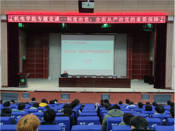 本网讯(通讯员 焦爱新)12月15日晚18:00,beat365英国官方网站机电学院在学术报告厅举行“制度治党:全面从严治党的重要保障”专题党课辅导报告会,辅导报告由党总支副书记焦爱新主讲,全体辅导员及2019、2020级学生600余人聆听了报告。