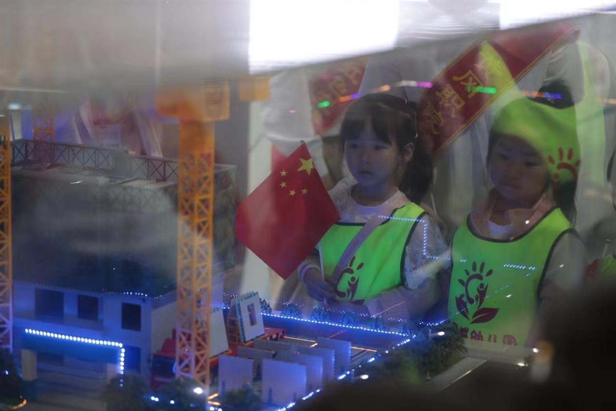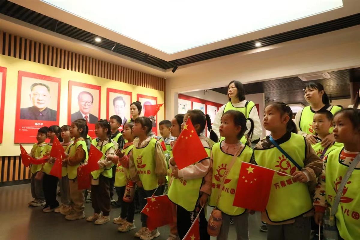 在将军厅,从电影《闪闪红星》讲起,讲解员又唱起了主题曲《闪闪的红星》,小朋友们随着歌曲的节奏挥舞起手中的国旗。