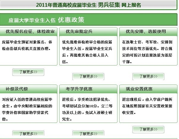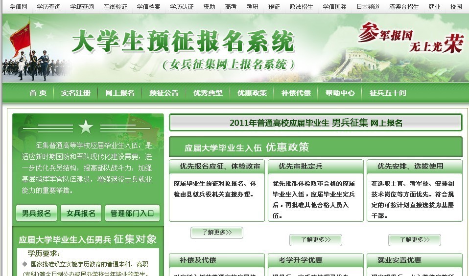 2011届应届毕业生预征报名图示 来源: 作者: 发布时间:2016-02-27 09:31:13 浏览次数: 次 【字体:小 大】 一、预征报名网址: 二、男兵征集对象要求: 三、应届毕业生入伍优惠政策: 四、应届毕业生入伍流程 分享到: 【打印正文】