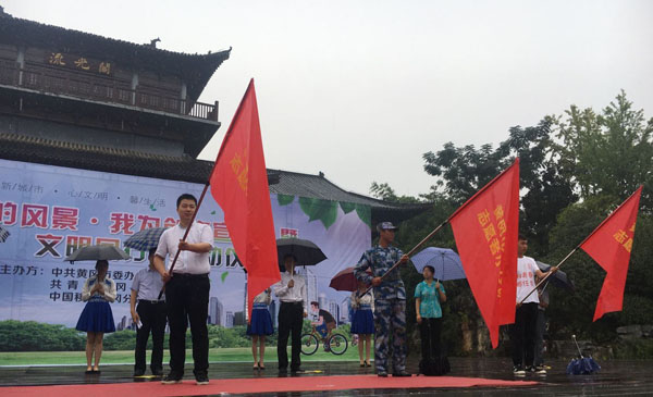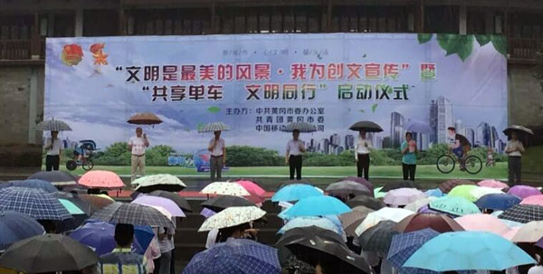 9月19日上午,黄冈市在遗爱湖公园临皋春晓广场举行“文明是最美的风景•我为创文宣传”暨“共享单车 文明同行”启动仪式。beat365官网学工处、团委组织科冯爱利老师带领100名青年学生参与该活动。