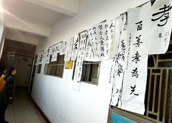 笔会在优扬悦耳的古典音乐背景下,与会者以酣畅的笔墨,用隶、楷、行、草诸体,抒发着各自对传统文化“孝道”的理解。同学们情绪高涨、书意甚浓、意犹未尽,活动从上午9时至下午2时方结束,创作出了十多幅优秀书画作品,这些作品将在文科馆五楼学生社团活动室外走廊陈列一周,欢迎大家前往鉴赏。