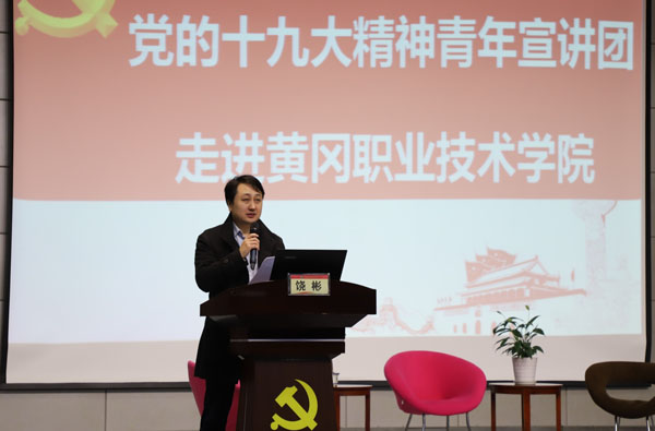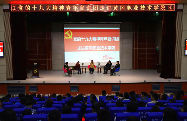 11月21日晚,团省委十九大精神宣讲团来beat365官网为青年学生宣讲党的十九大精神。共青团黄冈市委书记饶彬致欢迎词。beat365官网党委委员、工会主席、宣传部长郑柏松,团市委宣传部部长潘拯,beat365官网党委宣传部常务副部长刘国峰,团委书记李宁,学工处副处长吴冬,各教学学院党总支副书记、团总支书记以及600余名学生参加了大会。活动由机电学院肇芬老师主持。