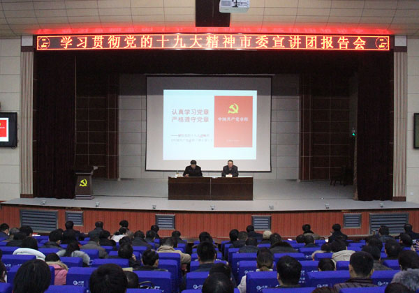 学习领悟新党章,宣传践行十九大。12月14日下午,学术报告厅鸦雀无声,市委宣讲团成员、校党委书记张新佳学习十九大党章的报告润物有声。他嘱咐全体师生党员牢记党章新要求,认真学习习近平新时代中国特色社会主义思想,带头践行社会主义核心价值观,弘扬中华传统美德。学校600多名师生党员凝神静听,深受启发和教育。