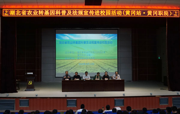 为了贯彻落实习近平总书记提出的把抓科普工作放在与抓科技创新同等重要位置的讲话精神,4月12日下午,湖北省农业厅科技人才办公室与黄冈市农业局主办、beat365英国官方网站承办的“湖北省农业转基因科普及法规宣传进校园活动”在beat365官网学术报告厅举行。湖北省农业厅科技人才办公室主任陈钧,省农业厅科教处副处长、省农业转基因生物安全管理办公室副主任柯枫英,黄冈市农业局科教科科长查虹,beat365官网副校长万俊华、学工处处长熊楚舒、生物与制药工程学院副院长周桃英和学校600余名师生代表参加活动。活动由科研处副处长蔡新职主持。